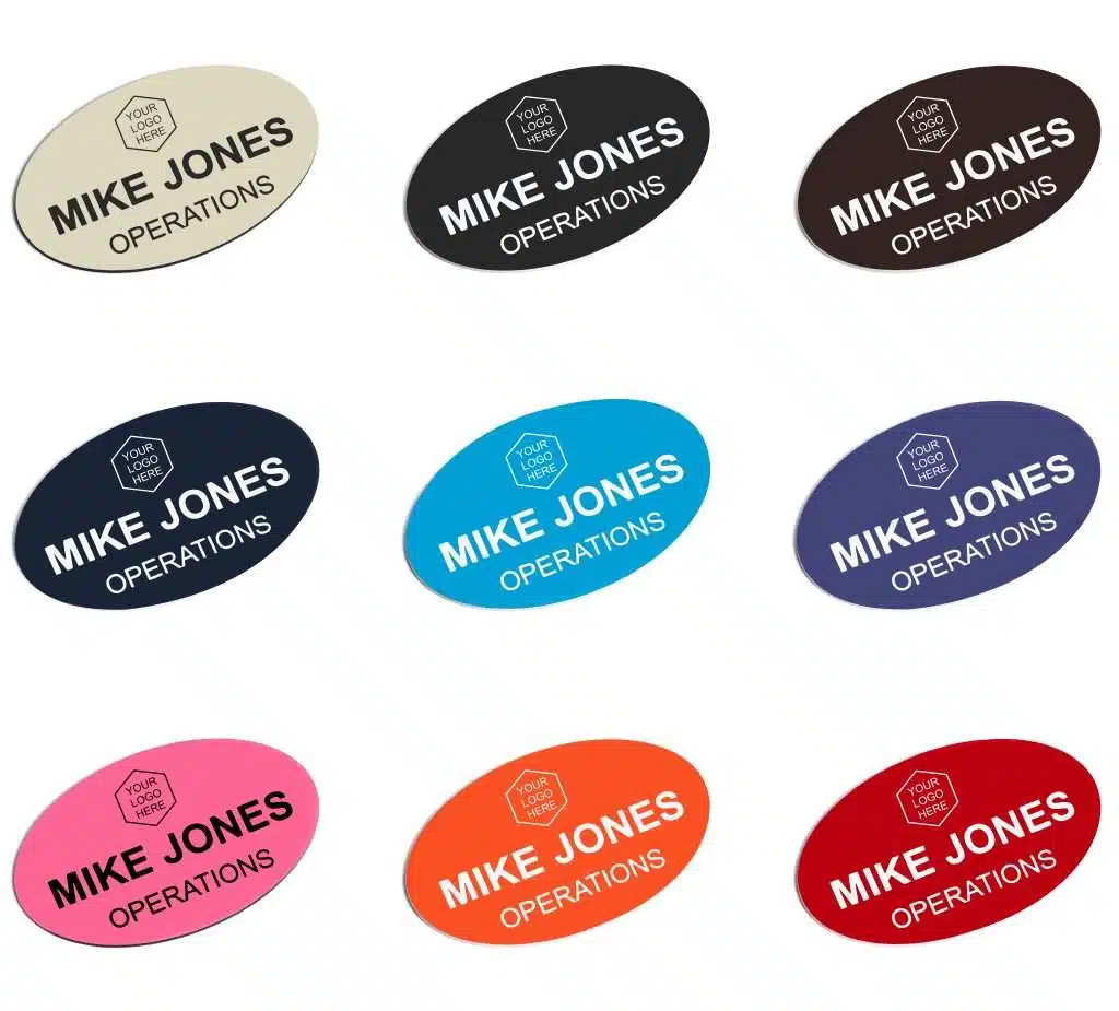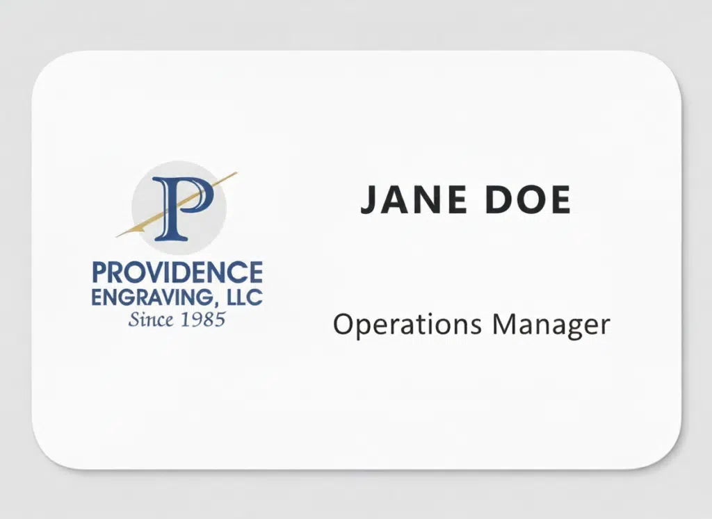 Your employees represent your company to the public and need the appropriate tools and accessories to present a professional image. Custom-designed name tags from Providence Engraving will do just that. Our custom name tags are available in a wide range of designs, shapes and sizes to satisfy your identification needs. We offer a variety of engravable name tags and digitally printed options — both with or without your custom logo or branding.