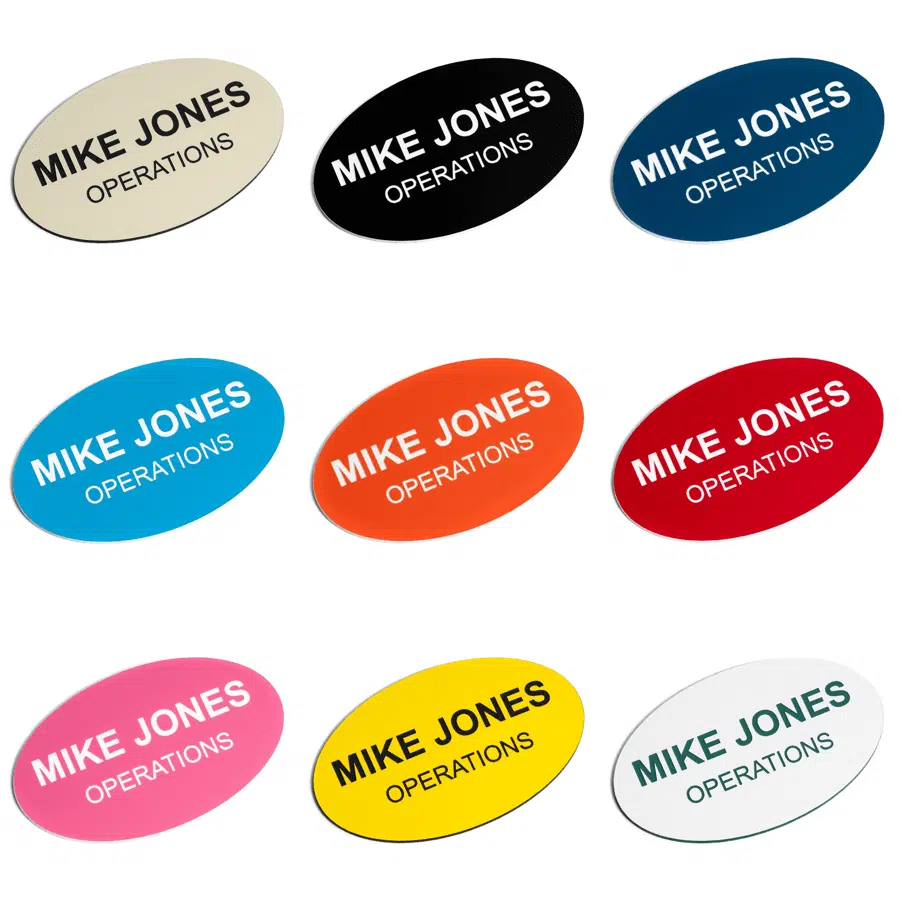 Choose between digitally printed or laser engraved styles. These are great of multicolor designs or logos. We also use the highest quality UV-curable ink. By using the CMYK color model, this allows for hundreds of color options on a single name tag with sophisticated color matching.